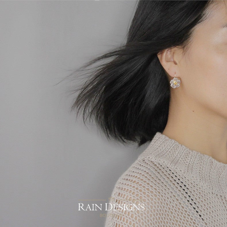 Discover the beauty of flowers in the rain and how they bloom and thrive in the midst of a storm. Specially grown White crystals specially formed the five petals of a flower in full bloom, subtle details are carved into each petal. The flowers are held by brilliantly crafted sterling silver. The gold version is 18K gold plated on 925s silver for color preference.  These earrings are our all-time favorite earrings studs.