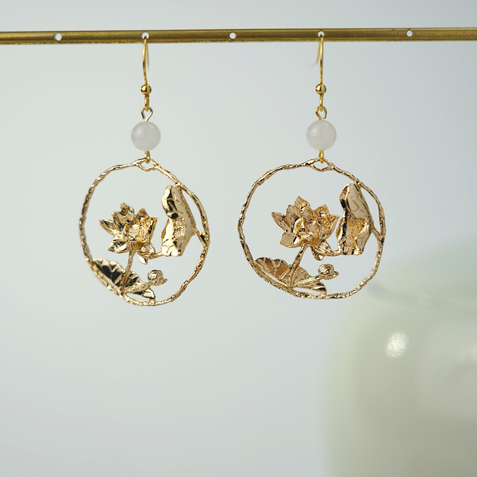 • Material: handmade with golden Lily pad and lotus flower, natural jade bead, and 14K gold plated ear hooks which are hypoallergenic.