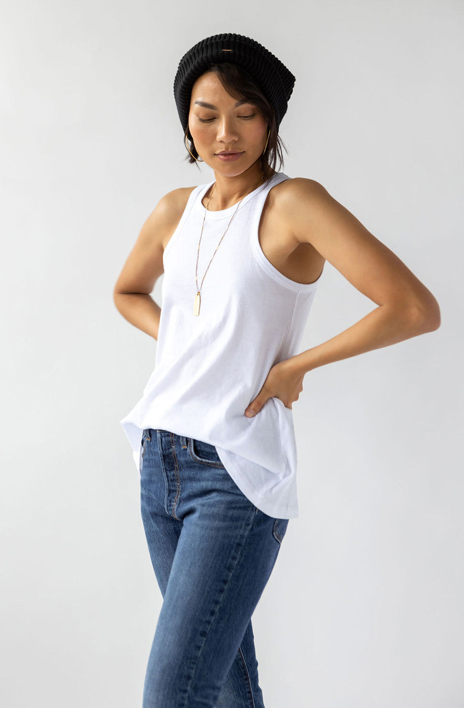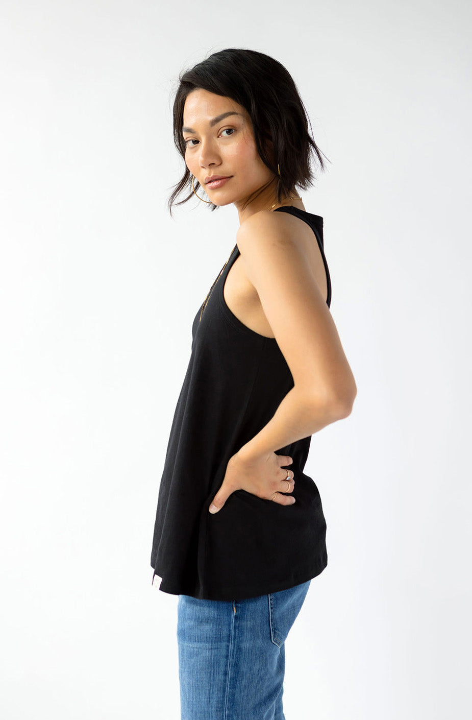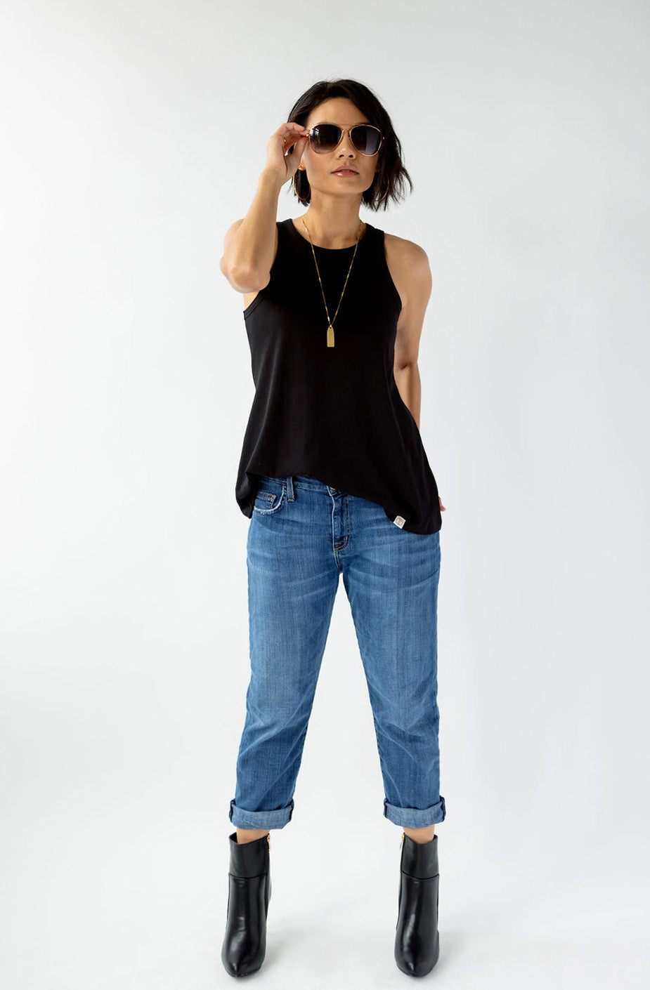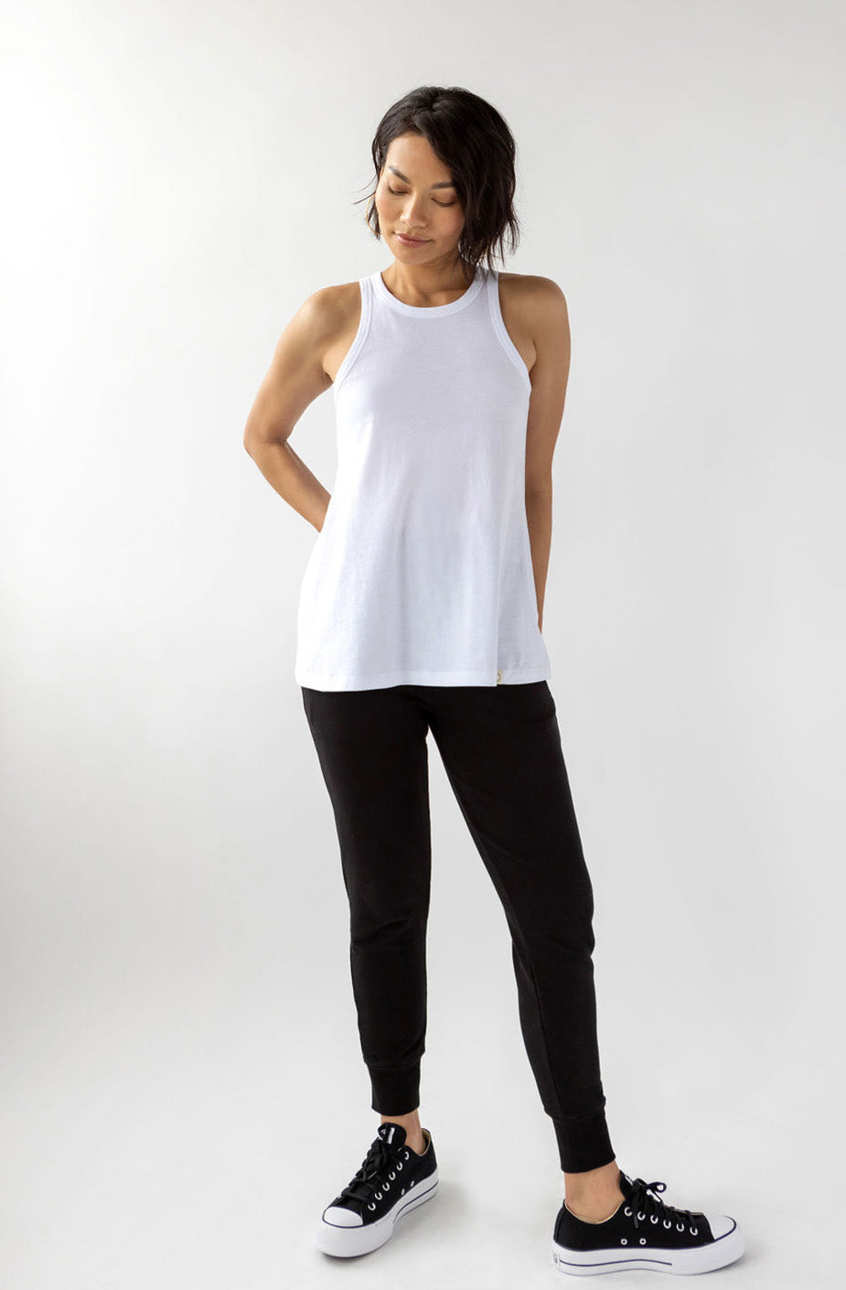 Show your sexy strength with this essential tank. Comfort and style have never looked so good. The KO is cut to show what you like to show and hide what you might want to keep for yourself. We like to pair the KO with our Drew Wide Leg Pant.
