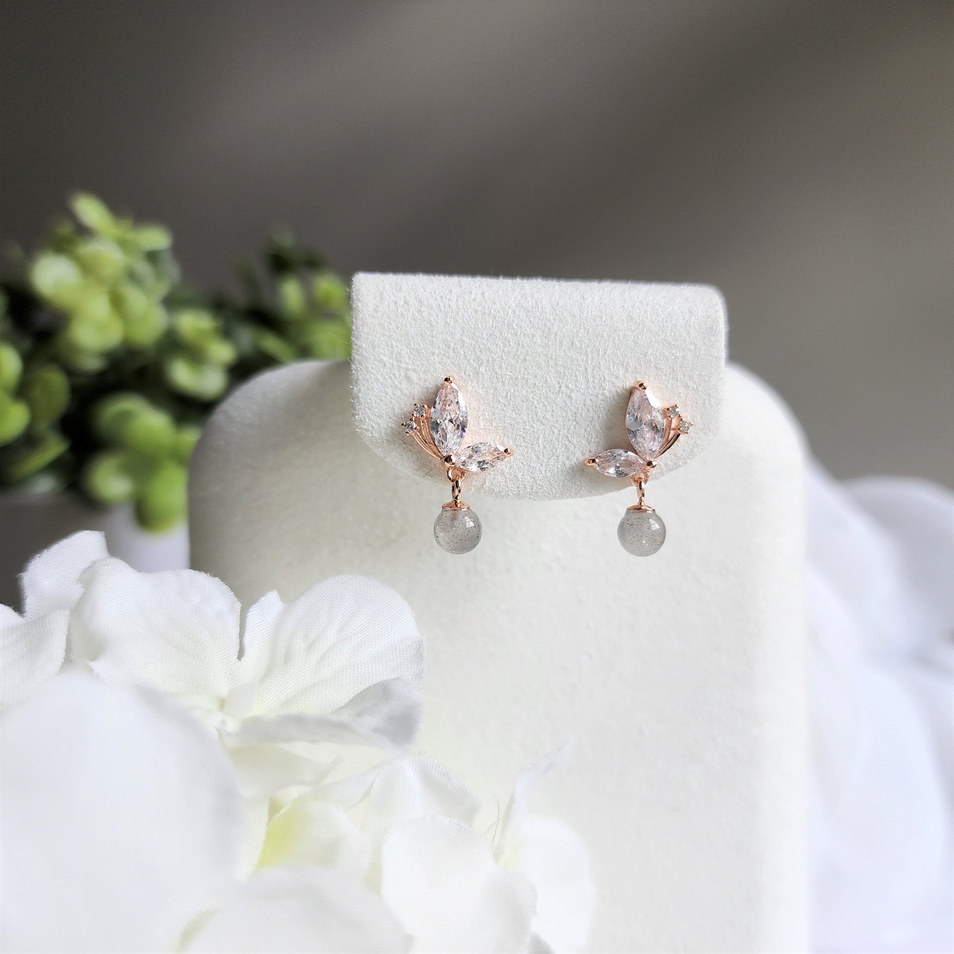 Our sweet moon stone butterfly earrings are made with grey moon stone and rose gold plated 925 sterling sliver which is good for delicate ears.